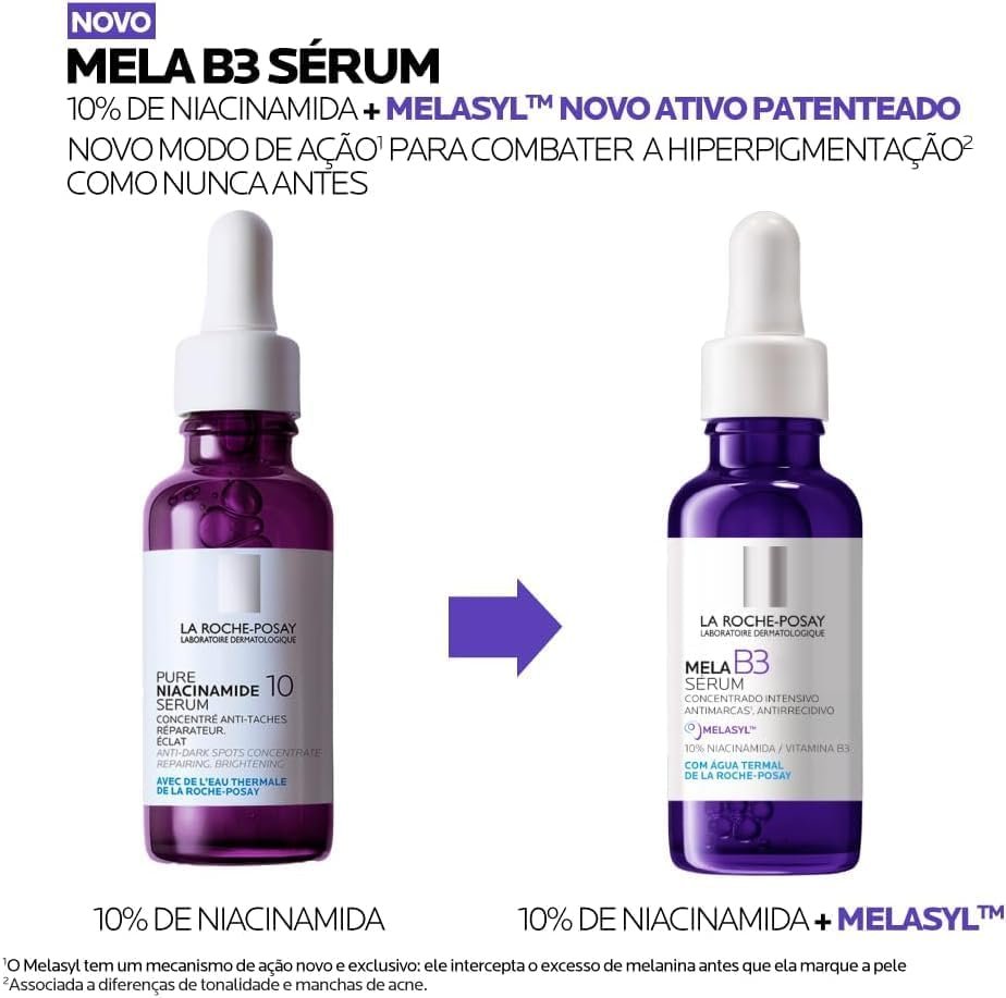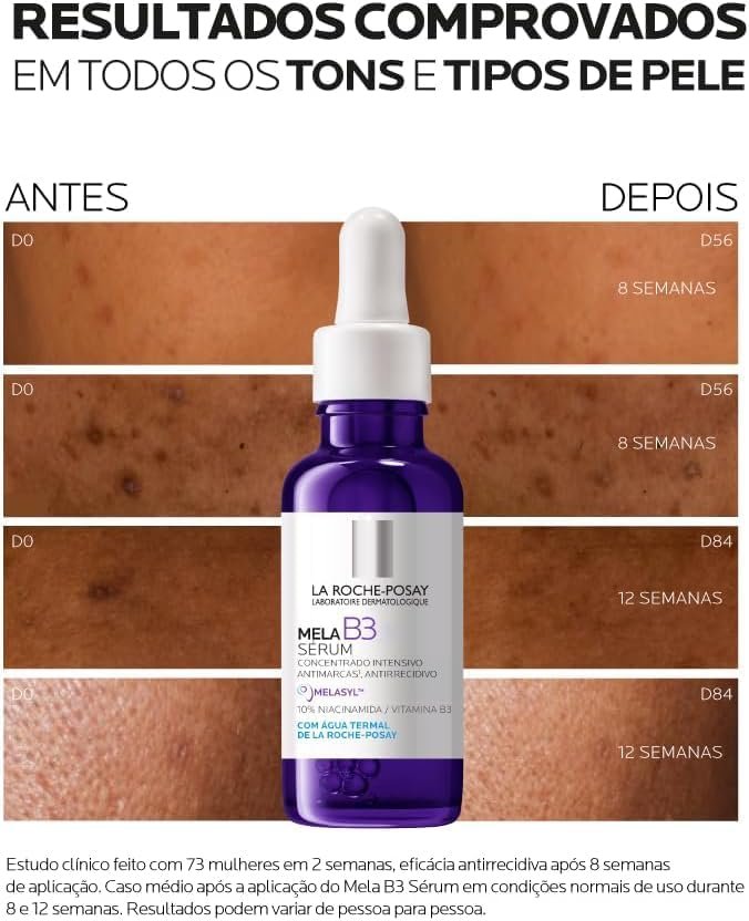 MelaB3 Sérum é o novo sérum concentrado antimanchas enriquecido com Melasy™, o mais novo e exclusivo ativo da La Roche-Posay, e 10% de Niacinamida. Criado após 18 anos de pesquisa, Melasy™ é um novo ativo patenteado para corrigir e previnir manchas como nunca antes. Com eficácia clínica comprovada, ele intercepta o excesso de melanina antes que cause diferenças de tonalidade na pele. Mela B3 Sérum reduz visivelmente manchas da pele, incluindo manchas solares, manchas pós acne e até mesmo manchas persistentes. Resultados visíveis em 1 semana, reduzindo e prevenindo o reaparecimento com eficácia comprovada em todos os tons e tipos de pele, inclusive as oleosas. Textura sérum não oleosa, leve e hidratante. Com uma experiência sensorial única para máxima eficácia e acabamento aveludado.