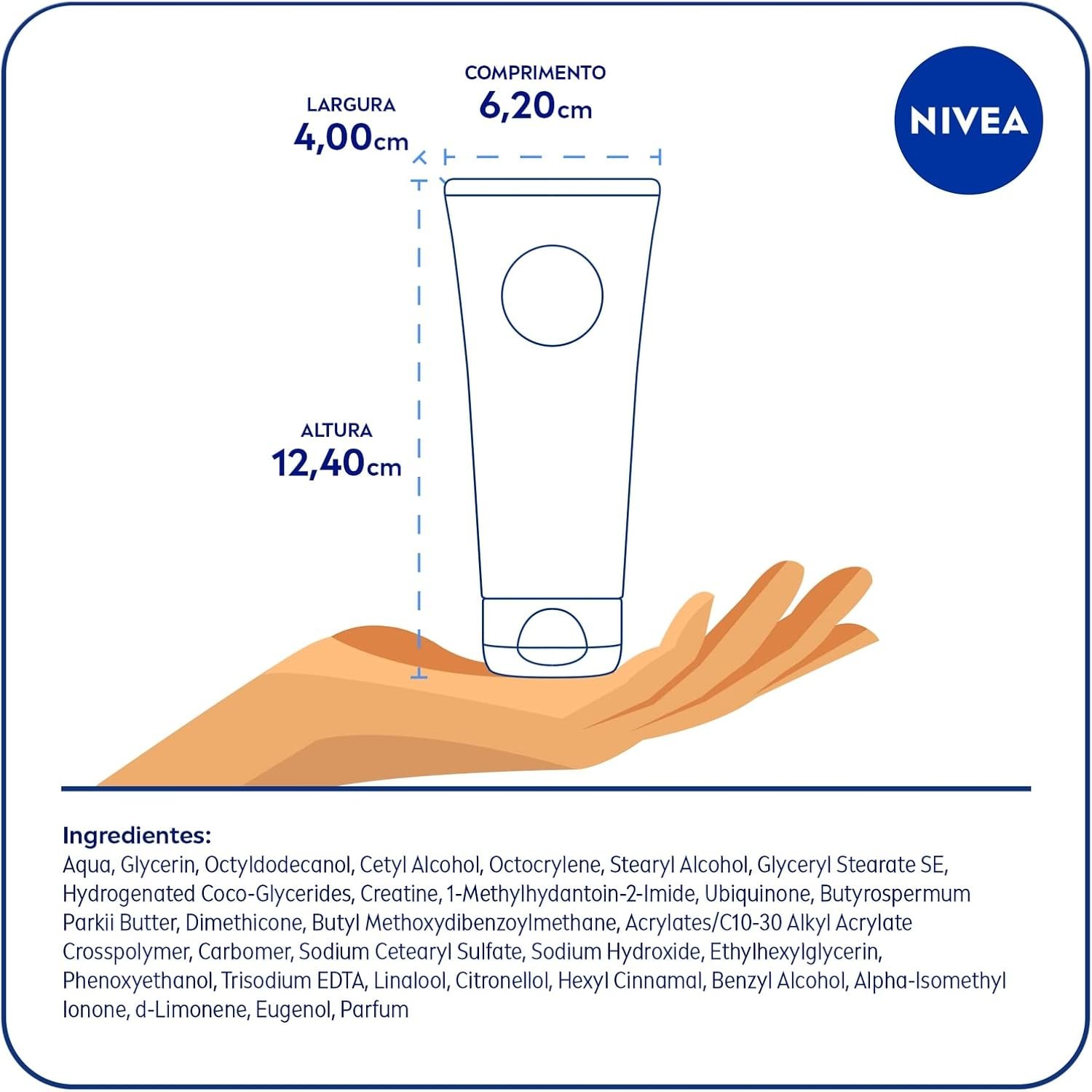 O que é? Creme para as Mãos NIVEA Q10 Plus hidrata, previne envelhecimento e reduz sinais da idade. Garanta o seu e cuide bem da sua pele! Para que serve o NIVEA Creme para as Mãos Antiidade Q10 Plus? Para todos os tipos de pele. Sua fórmula com Q10 Plus, coenzima produzida naturalmente no corpo, estimula a renovação celular. Benefícios e diferenciais – Hidratação por 24h – Q10 Plus previne envelhecimento – Antissinais e Anti-idade – Dermatologicamente testado Como usar o NIVEA Ceme para as Mãos 3 em 1? Aplique 4 vezes ao dia ou sempre que necessário sobre as mãos limpas e massageie bem. Uma unidade de embalagem contém 75g
