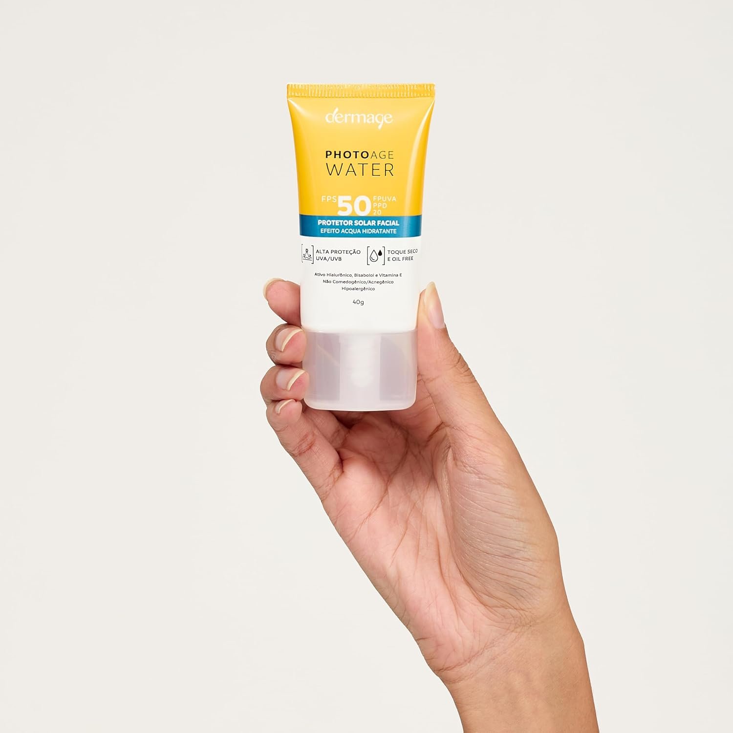 O Dermage Photoage Water FPS 50 é um revolucionário protetor solar aquoso que chega para reinventar a fotoproteção diária. Com fórmula avançada, ele oferece uma combinação única de benefícios que o tornam o aliado perfeito para uma rotina de cuidados com a pele. Sua exclusiva textura Acqua Fluid oferece toque seco e absorção ultrarrápida, sendo ideal para uso diário e mesmo antes da maquiagem. Possui Tecnologia Double UV Protect, criando uma película protetora imperceptível que se adapta perfeitamente às irregularidades da pele, proporcionando uma cobertura uniforme e eficaz contra os nocivos raios UVA e UVB. Isso significa que você conta com uma proteção solar de alto espectro (FPS50 e PPD/FPUVA20) sem aquele indesejado resíduo esbranquiçado ou textura pesada na pele.